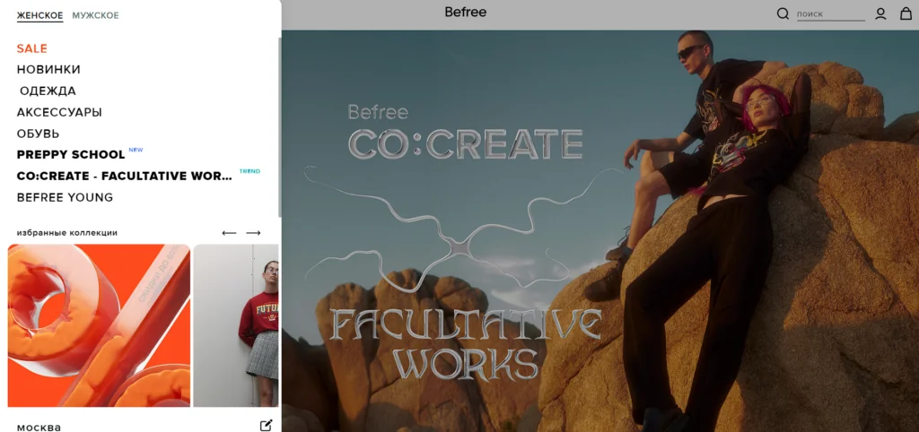 - Распродажи. Befree снижает стоимость определенных групп товаров в рамках сезонных и постоянных скидок. Одежду и обувь, участвующую в Sale, выносят в специальный раздел на сайте, ассортимент которого часто обновляется. Код позволяет совершать выгодные покупки. В некоторые периоды размер экономии может достигать 65%.