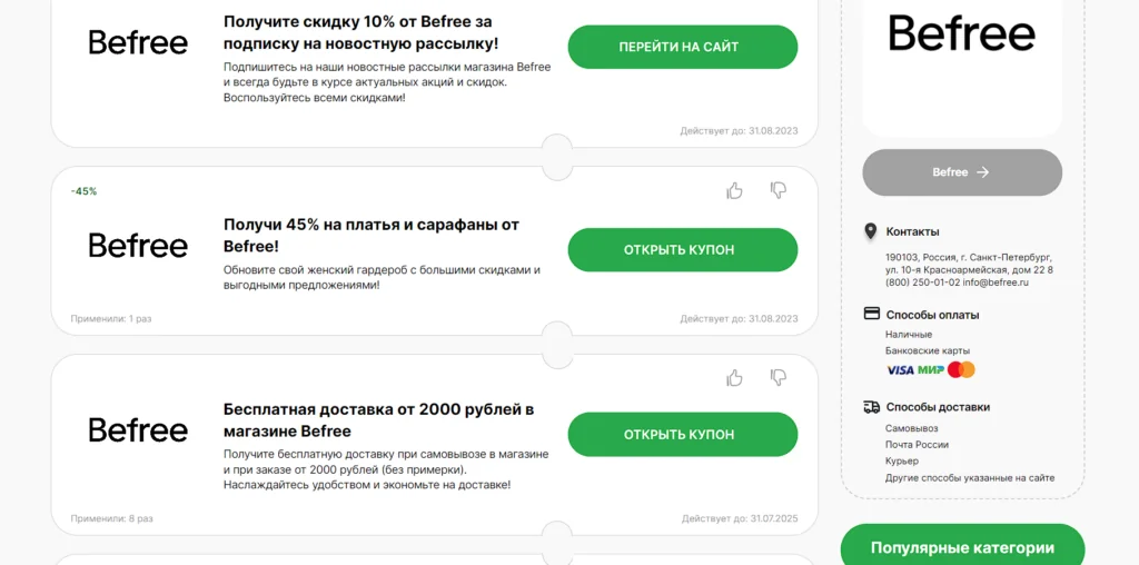 Совершить покупку и получить скидку можно не только в розничном магазине, но и онлайн на сайте Befree. Для клиентов, любящих экономию с промокодами, разработано мобильное приложение, с помощью него можно сделать покупки по низким ценам с использованием кода через Интернет befree.ru/mobile-apps.