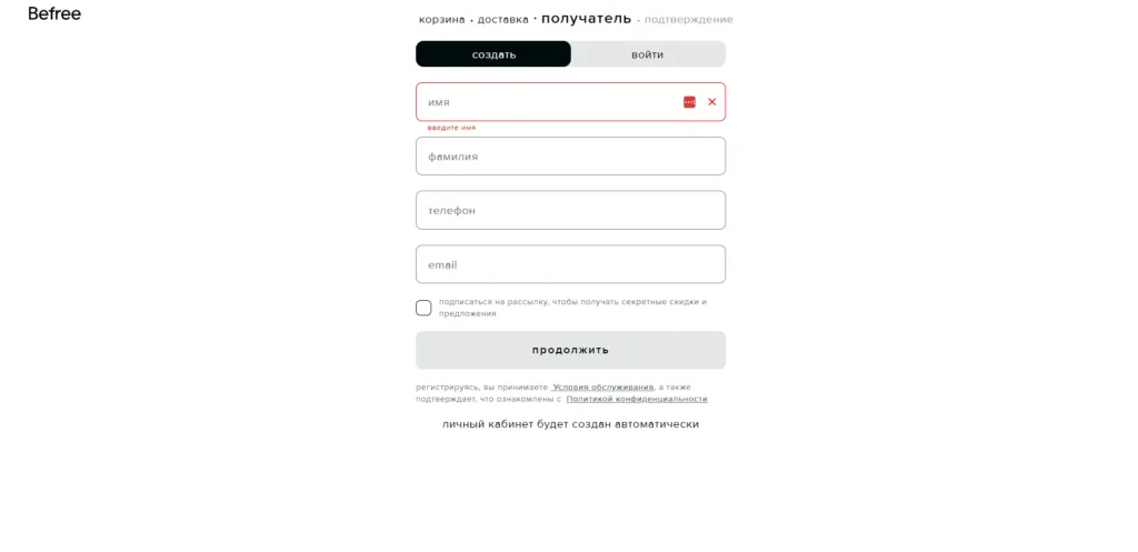 Шаг №7 – Проходим регистрацию/авторизацию на befree.ru. Пишем имя, фамилию, телефон и электронную почту. После этого жмем “Продолжить”.