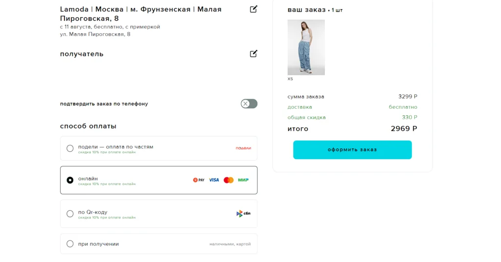 Шаг №8 – В новом окне магазина проверяем информацию о заказе. Определяемся со способом оплаты: по частям, онлайн, по QR-коду или при получении. Справа у вас будет указана скидка на заказ. Затем нажмите на “Оформить заказ”. На почту придет сообщение о сроках доставки и другой информацией о заказе.