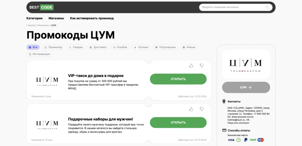 - Промокоды. Промокоды магазина дают возможность приобрести товары с существенным дисконтом. Скидки могут предоставляться на весь ассортимент или продукцию определенных марок.