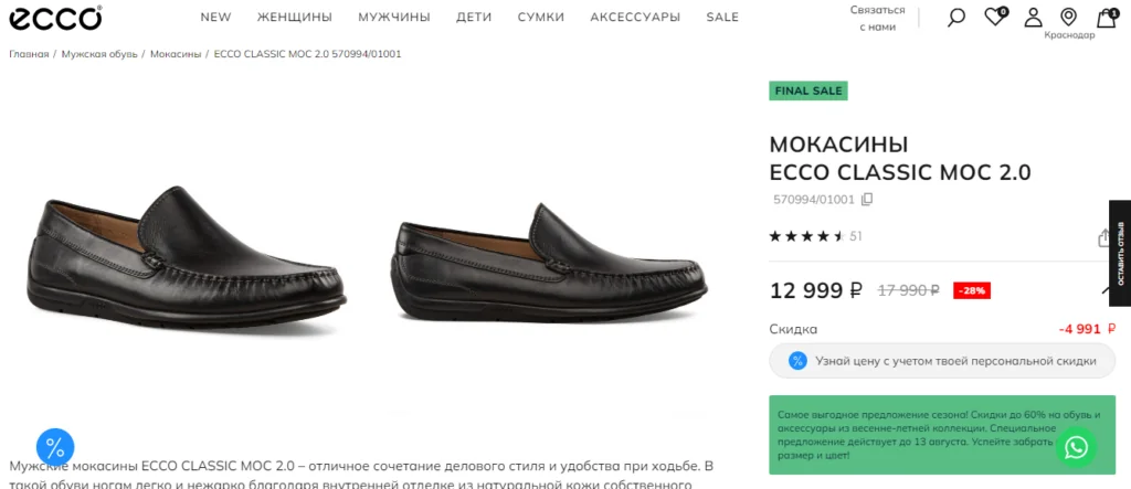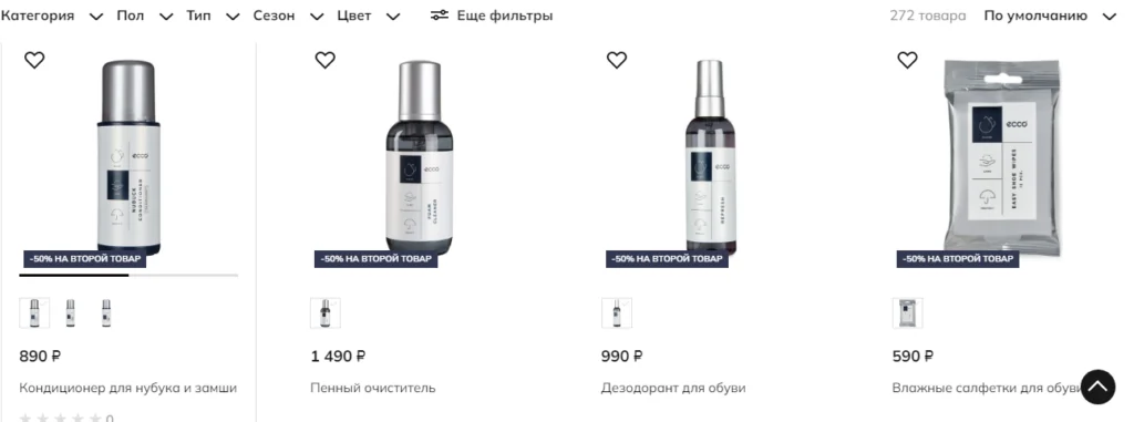 Для удобства пользователя весь товар разделён по категориям. Тем, кто хочет ознакомиться с новинками бренда, будет особенно интересен раздел NEW, в котором предложены самые последние модели «Экко». Ну а для тех, кто хочет сэкономить, предназначен раздел SALE. Это постоянная распродажа, в которую входят старые или сезонные коллекции. Кроме того, иногда производитель предлагает выгодные промокоды на свою продукцию.
