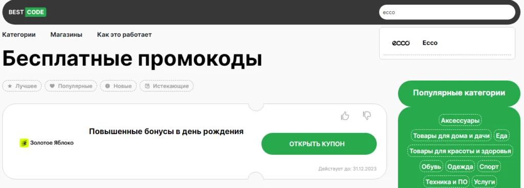 Шаг №2 – Если кодов на данный момент нет, выберите подходящую вам акцию и кликните по ссылке «Перейти на сайт» или «Открыть купон». Если есть, то копируете значение промокода и переходите на сайт.