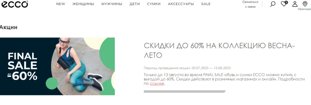 - распродажи – на самом сайте в разделе SALE предложен богатый выбор моделей, которые реализуется уже с существенной скидкой (например, финальная распродажа -60%);