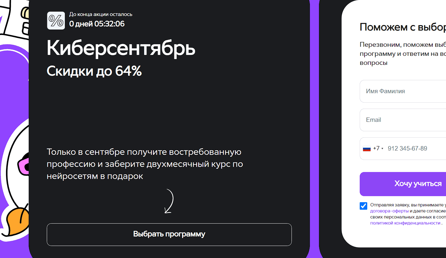 - Далее введите свое имя, фамилию, мобильный телефон и электронную почту. Кликните на кнопку “Хочу учиться” и завершите оформление покупки образовательной программы.
