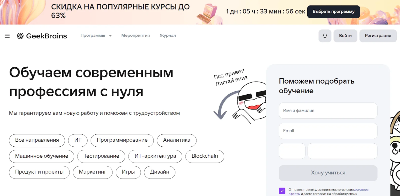 - Найдите подходящую акцию, а затем перейдите на сайт GeekBrains.