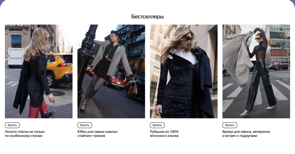 Подобрать стильный образ поможет раздел «Коллекции». Здесь вы найдете комплекты одежды для работы, отдыха, выхода в свет и вечеринок. А в разделе «Basic» представлены вещи, составляющие основу любого гардероба.