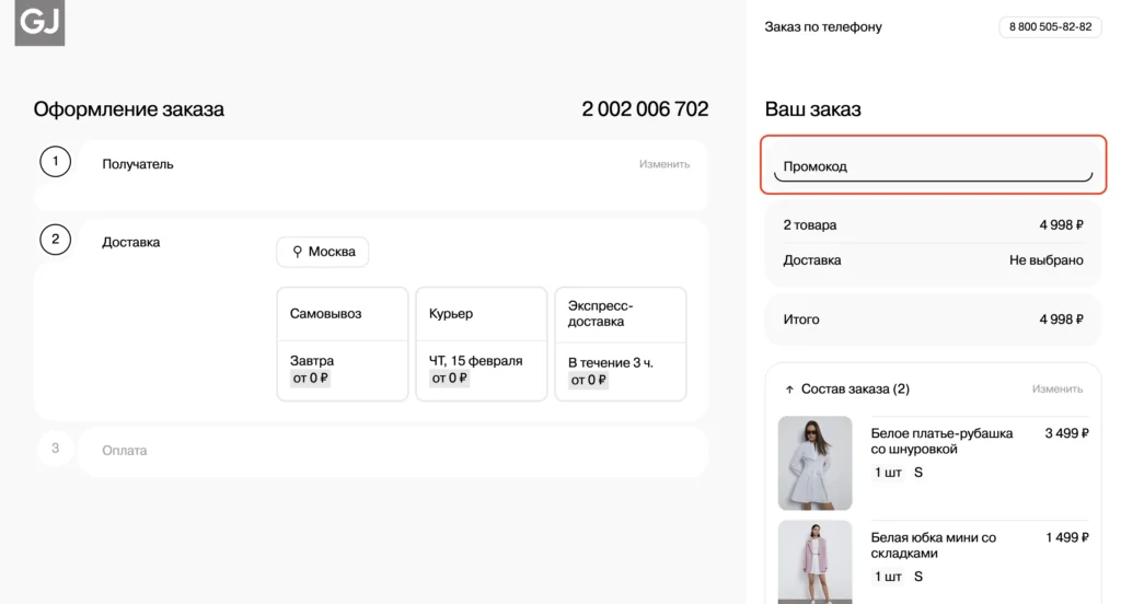 Все промоакции GJ представлены на нашем сайте. Если вы нажмете на надпись «Открыть купон», вам предложат перейти на сайт бренда на страницу с акционным предложением. Под надписью «Показать промокод» находится код, который нужно активировать при оформлении покупки и который дает возможность получить скидку. Чтобы его использовать, следует соблюдать следующую последовательность действий.