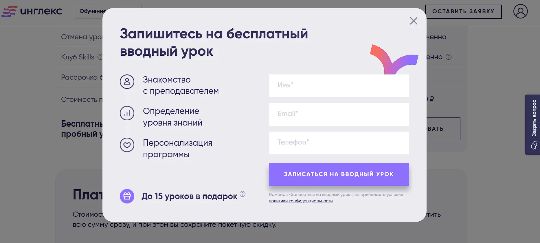 - бесплатные уроки – одно ознакомительное занятие можно оформить бесплатно в школе Инглекс. Оставьте номер своего мобильного телефона, email и ФИО в специальной форме на сайте, чтобы его получить.