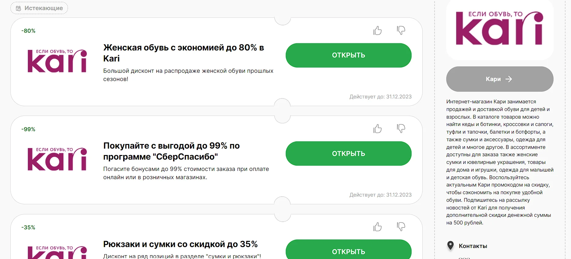 Компания Кари обладает рядом важных преимуществ. Онлайн-магазин обладает широким каталогом обуви на все сезоны и аксессуаров. Здесь представлена особая линейка детских товаров под названием Кари Кидс. Маркетплейс постоянно устраивает акции и распродажи для привлечения новых покупателей. Система отправки товаров по российским городам предусматривает курьерскую доставку, а также самовывоз из пунктов выдачи и магазинов. Кари обувь можно получить с помощью почты России. Ищите на сайте сервиса bestcode.ru промокоды Кари, которые помогут получить скидку в размере 8 процентов на новинки, либо приобретайте настольные игры с экономией в 30 процентов.