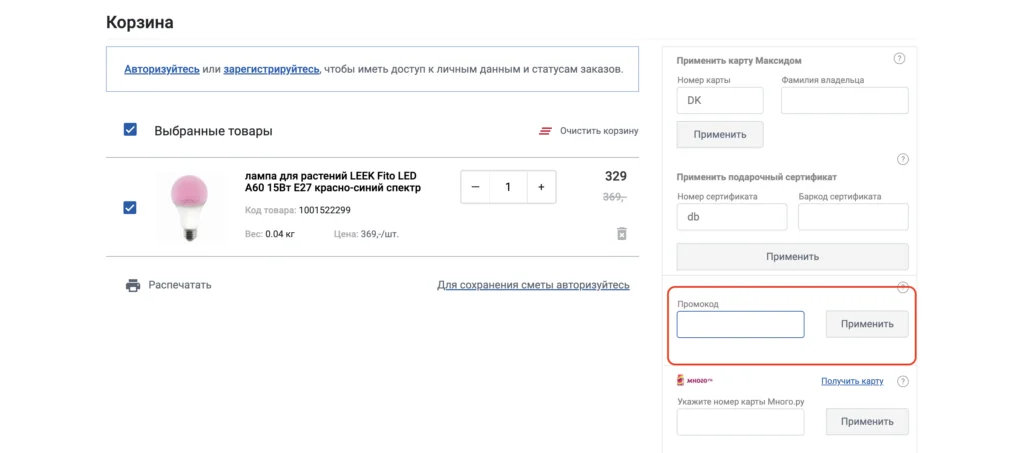 3. Перейдите в раздел «Корзина» и найдите блок «Промокод». Вставьте в него скопированный код, нажмите «Применить». Система рассчитает скидку по акции, величина дисконта отразится на экране. Перейдите к оформлению заказа.