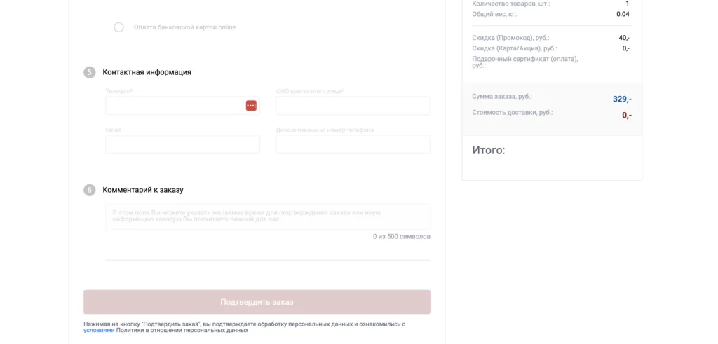 4. Введите адрес доставки или укажите магазин, из которого вы заберете товары. Отметьте удобный для вас способ оплаты (при получении или онлайн). Внесите свои контактные данные. После оформления заявки вам придет смс с подтверждением от магазина.