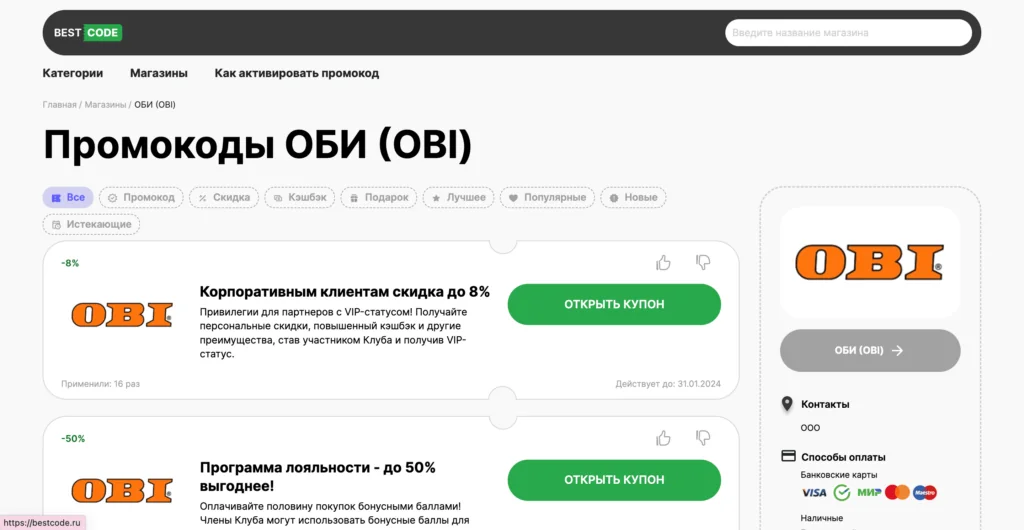 Промокоды сайтов, похожих на ОБИ (OBI)
