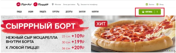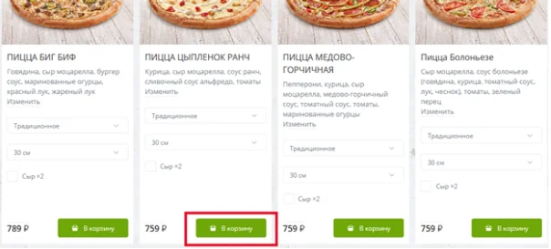 Шаг 2. Выберите понравившуюся пиццу, другие блюда и напитки, и добавьте их в корзину.
