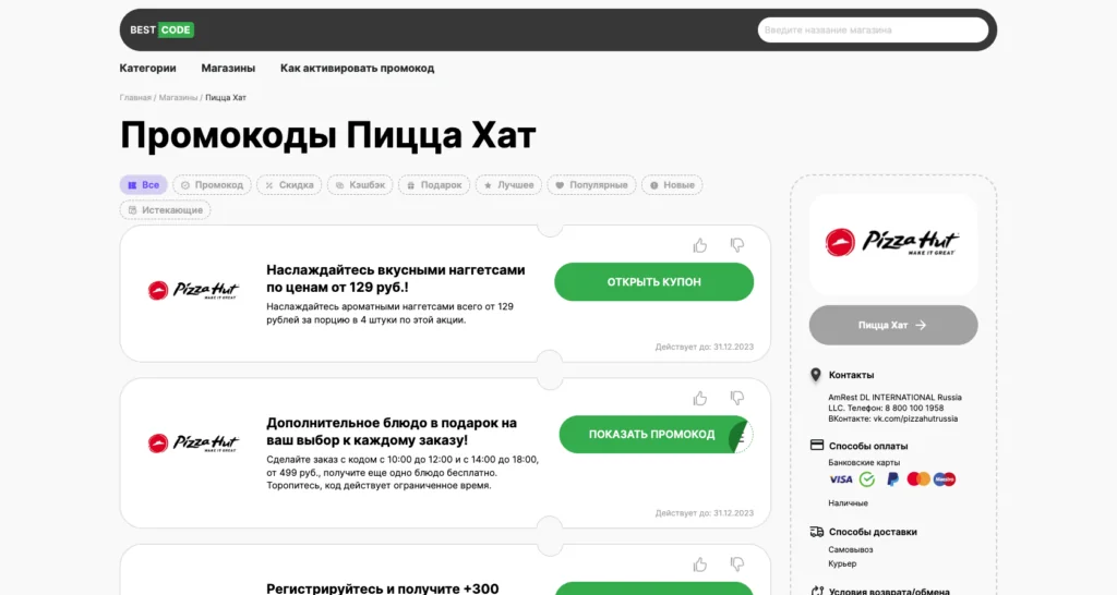 - Промокоды. Действующие купоны на скидку в Пицца Хат вы можете найти на нашем сайте. Они дают возможность получить discount или подарок.