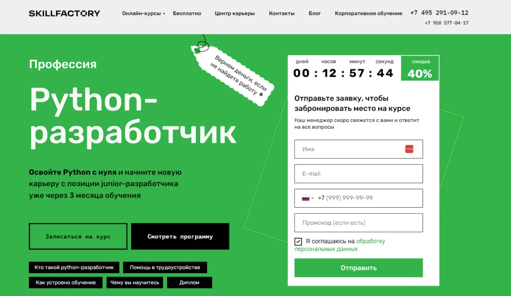 Шаг №5 – Укажите имя, фамилию, телефон, электронную почту и добавьте скопированный ранее код, который даст скидку. Отправьте заявку. В ближайшее время с Вами свяжется оператор, чтобы забронировать место на курсе, обсудить детали обучения и выбрать схему оплаты.