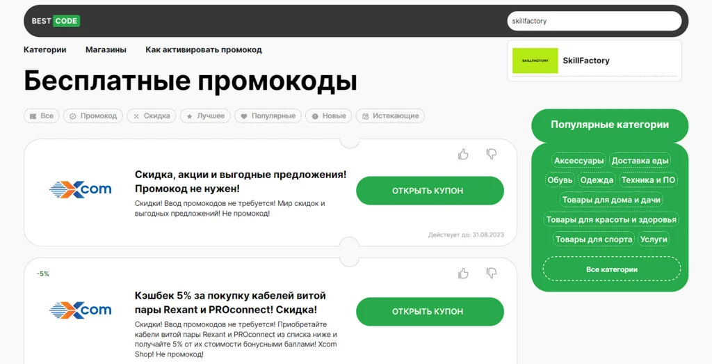 Шаг №1 – На сайте bestcode.ru в правом верхнем углу в строке поиска введите название Skillfactory и перейдите на страницу сервиса.