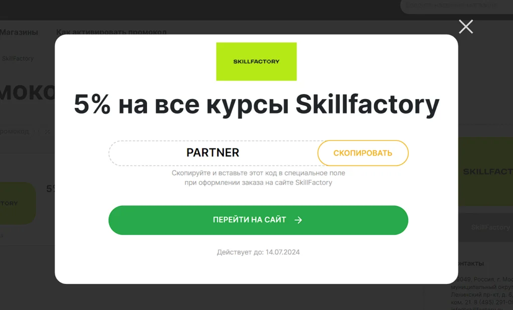 Скидка по промокоду не суммируется с другими на сайте. Скопируйте и введите промокод Скиллфактори на сайте. Скидка ограничена по времени.