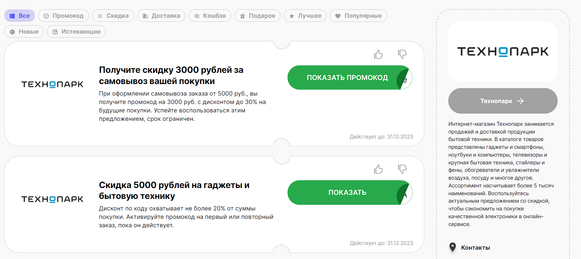 - На сайте bestcode.ru на странице магазина Технопарк выберите себе акцию для получения скидки: купон, который активируется автоматически при нажатии, либо скопируйте промокод.