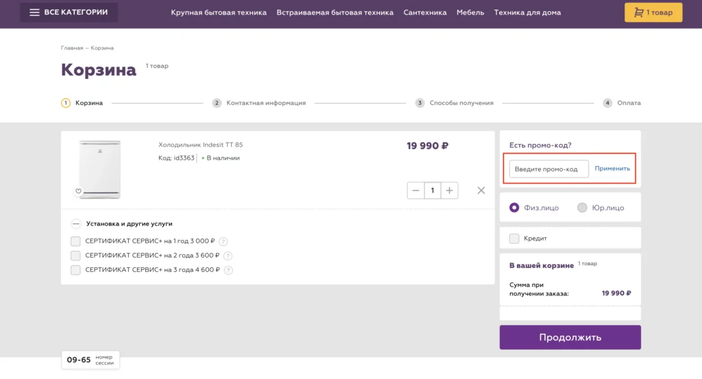 4. Введите скопированный ранее код в поле «Есть промо-код?». Нажмите «Применить». Система рассчитает скидку.
