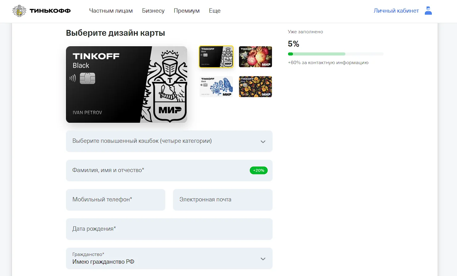 - Определитесь с дизайном карты, с категорией повышенного кэшбека, а также укажите данные ФИО, телефона, email и паспорта.