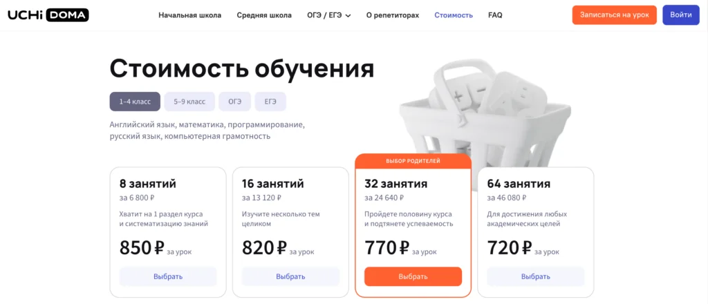 Шаг 3. Перейдите во вкладку «Стоимость». Выберите академическую цель (начальная школа, средняя школа, ОГЭ/ЕГЭ).