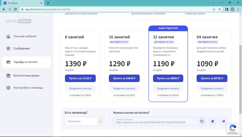 На платформе действует система акций и скидок. Чтобы сэкономить, просто введите скидочный код и получите бонус на занятия с репетитором.