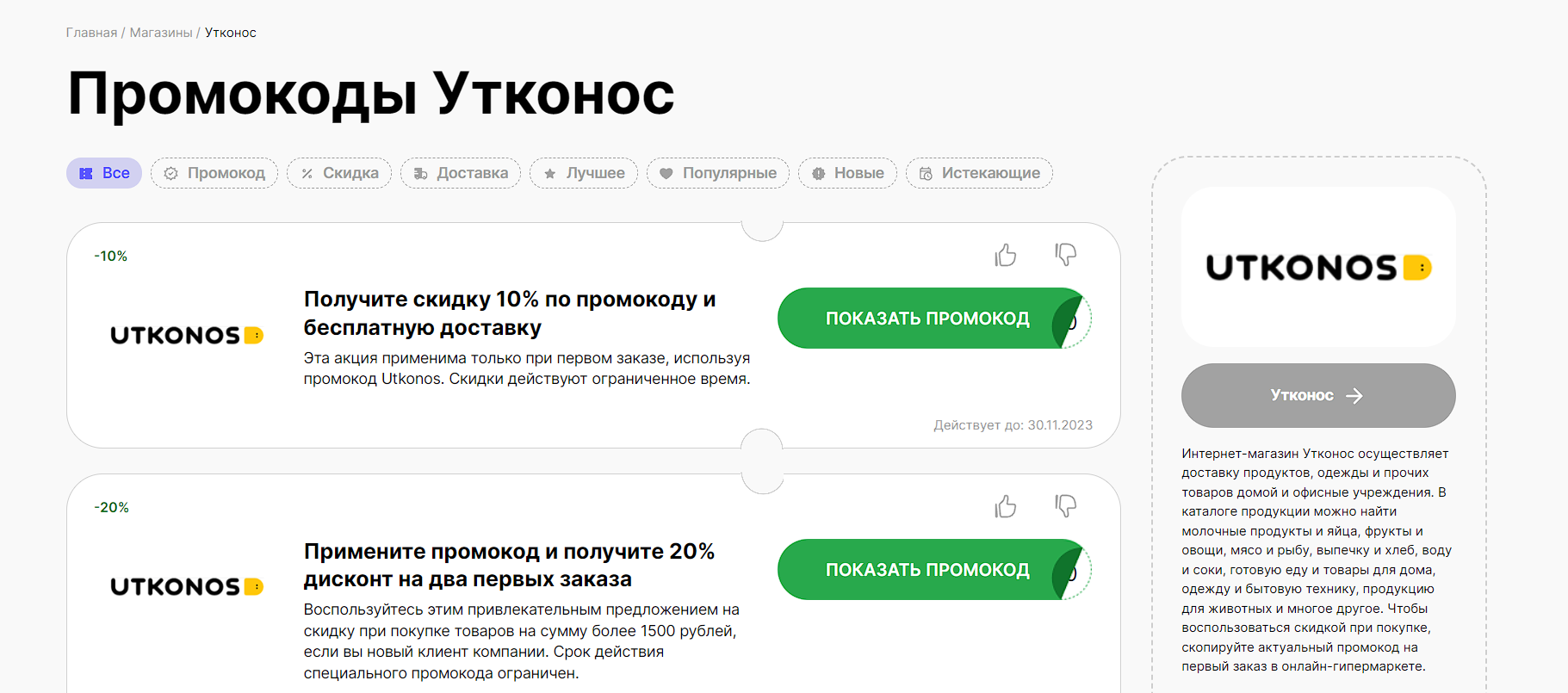 - купон Утоконос – специальные акции с экономией до 50-70 процентов, включая подарки, распродажи и другие предложения;